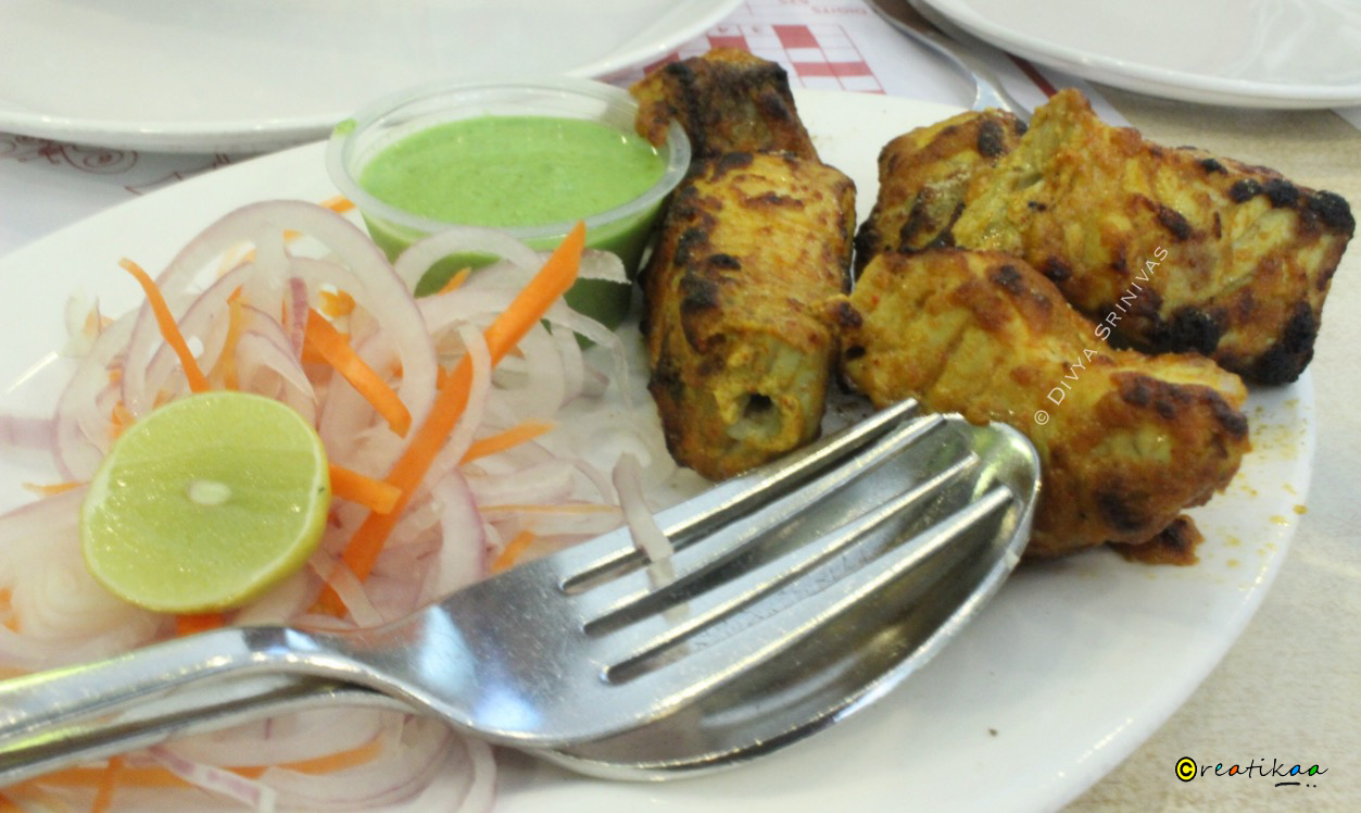 As we settled here for lunch and my partner got to rush to his office, we didn't delay much with our order. A small portion of food to satisfy our hunger and the food arrived pretty fast. And the starter 'Fish Tikka' was the best choice, succulent and flavourful cubes of boneless fish with the mint chutney was perfecto. Before we could finish off the fish, the hot Egg Biriyani, Roti and Murgh Patiyala made its way to the table.